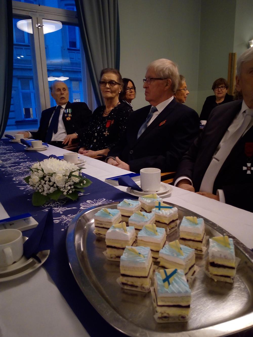 Sali oli juhlallisesti koristeltu! Olavi Haapala tarjosi lohi- ja lihavoileipiä sekä Itsenäisyysjuhlaleivoksia.