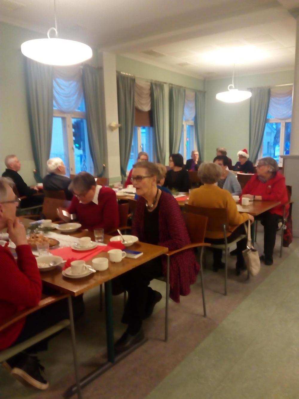 Kahvin tarjoiluvuorossa olivat Tellervo Anttinen, Pekka Ahonen ja Leena Koski-Ahonen, kauemmassa pöydässä mm.ssa illan musiikkivastaava Tuula Peltomäki.