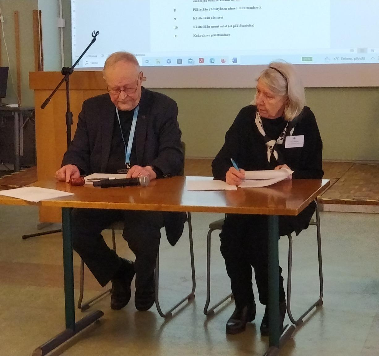 Kokouksen puheenjohtaja Reijo Sallinen ja sihteeri Ritva Väisänen.