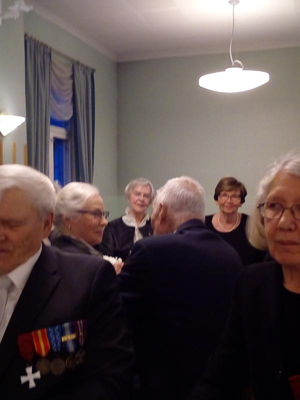 Olavi Haapala tarjosi kahvit, lohivoileipien, lihavoileipien ja leivosten kanssa. Sali oli Isänmaallisesti koristeltu.